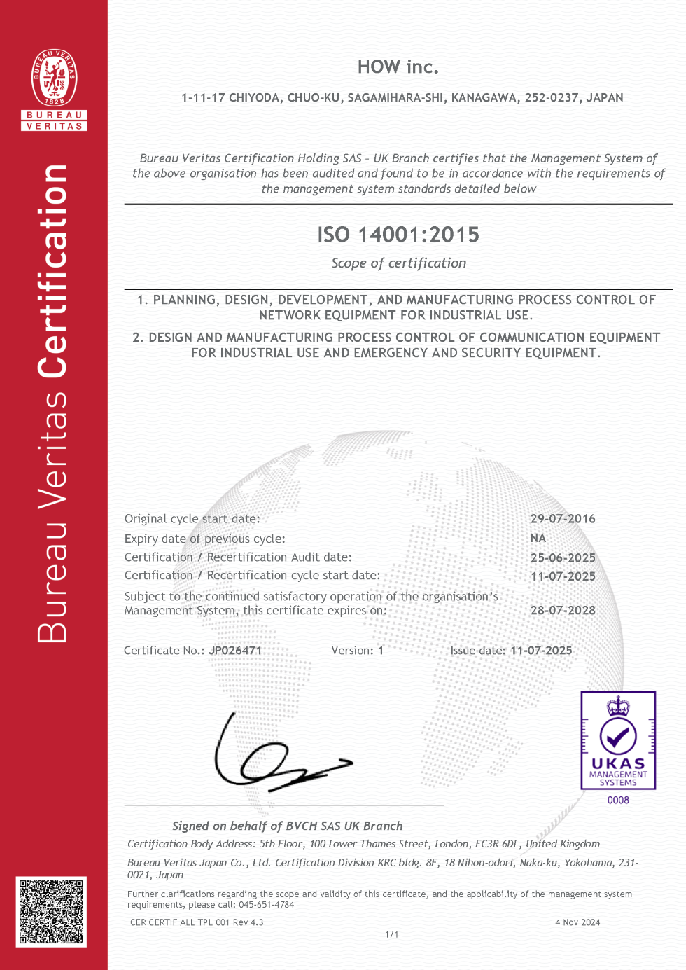 当社は2016年7月29日に、イギリス認証機関(UKAS)の審査機関であるビューローベリタスジャパン株式会社から『ISO14001』の認証を取得いたしました。