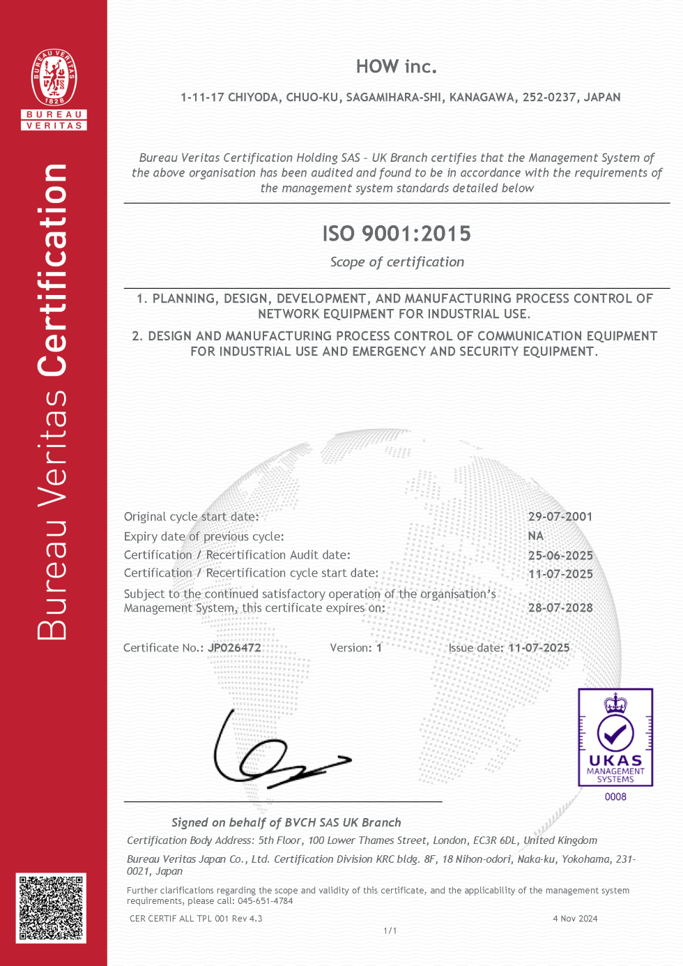 当社は2001年7月29日に、イギリス認証機関(UKAS)の審査機関であるビューローベリタスジャパン株式会社から『ISO9001』の認証を取得いたしました。これは当社が生産する製品の設計開発・試作・試験に至る範囲の品質マネージメントシステムを保証するものです。
